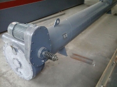 二、结构:螺旋除渣机是一种螺旋轴式送料机。利用螺旋叶片转动而推移物料。主要由螺旋体,进出渣口及驱动装置三大部件组成。进渣口由方形法兰构成,出渣口位于筒体下部。驱动装置由蜗杆、蜗轮减速机组成,设有安全离合器,出现超载时起保护作用。宜于输送各种粉状、粒状及小块物料,如:炉渣、煤粉、面粉、砂石、谷物等。多用在较低或中等输送量,(一般低于10m3/h)输送长度不大的情况下(一般为3-5m以下,倾角小于40°)。